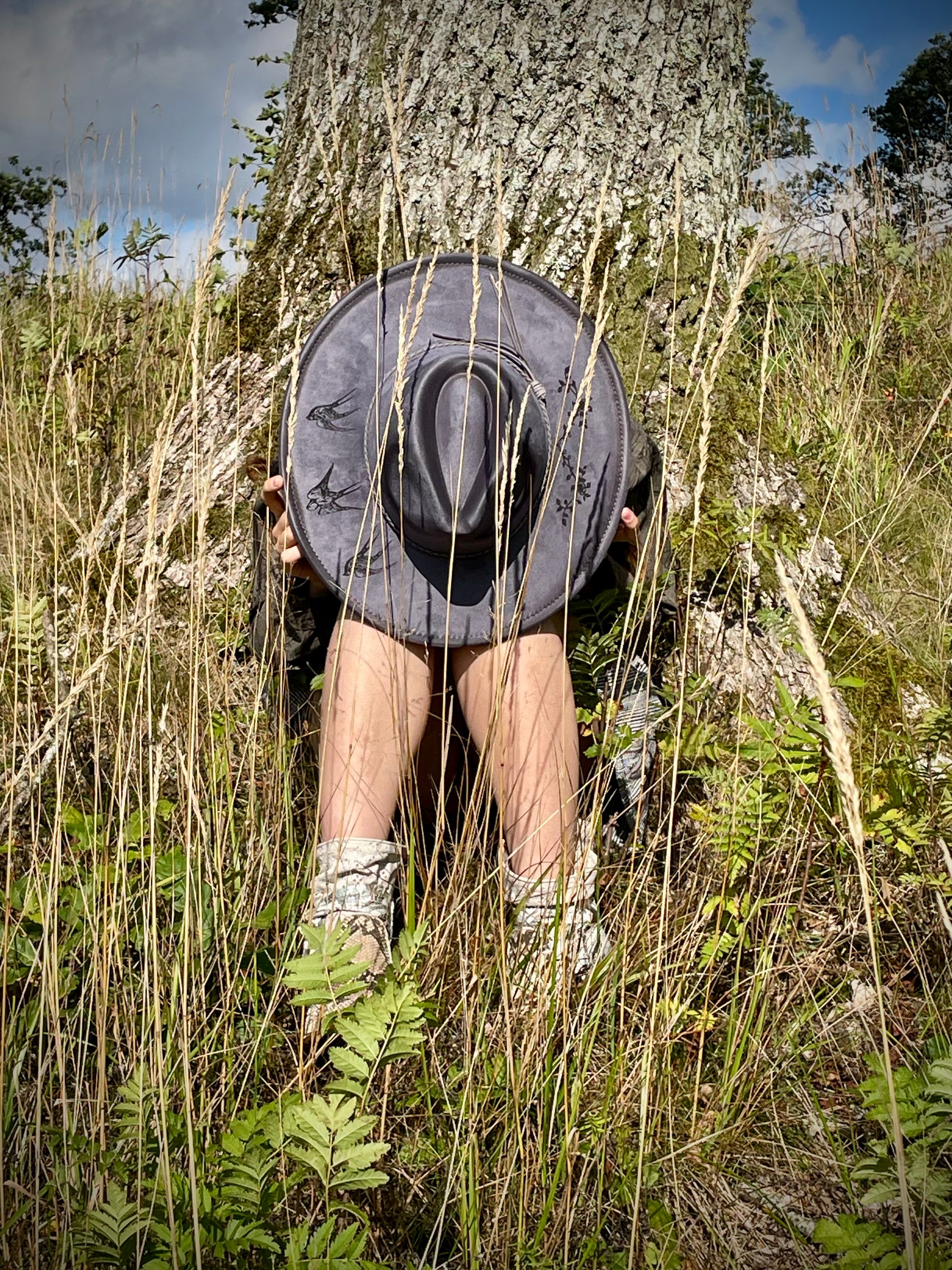 Cowboyhatt med vacker inbränd design av svalor på ena sidan och delikata blommor på andra sidan.