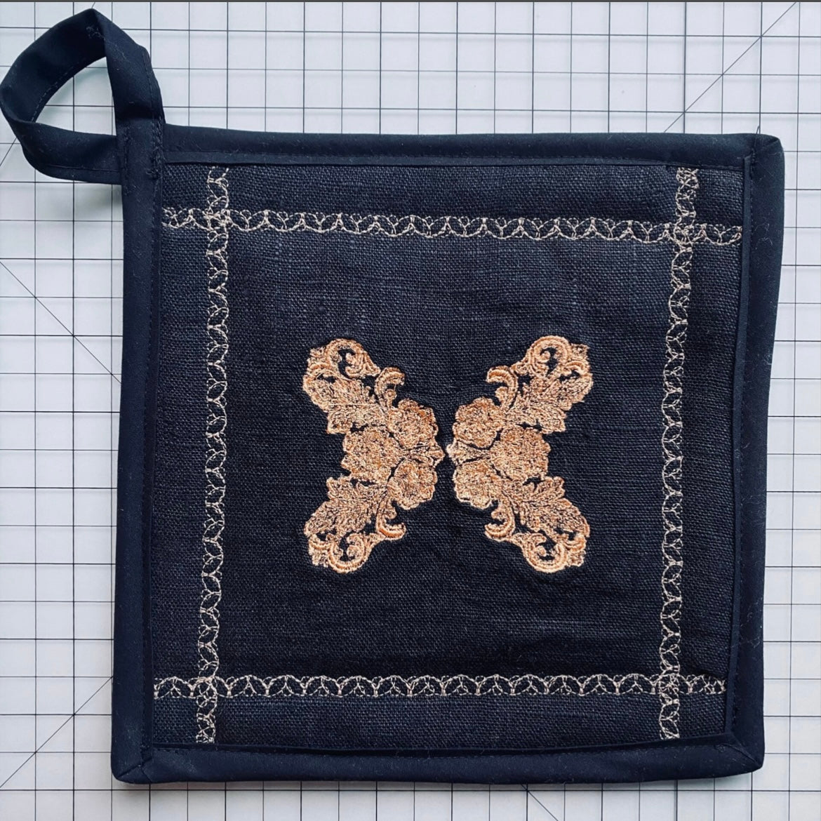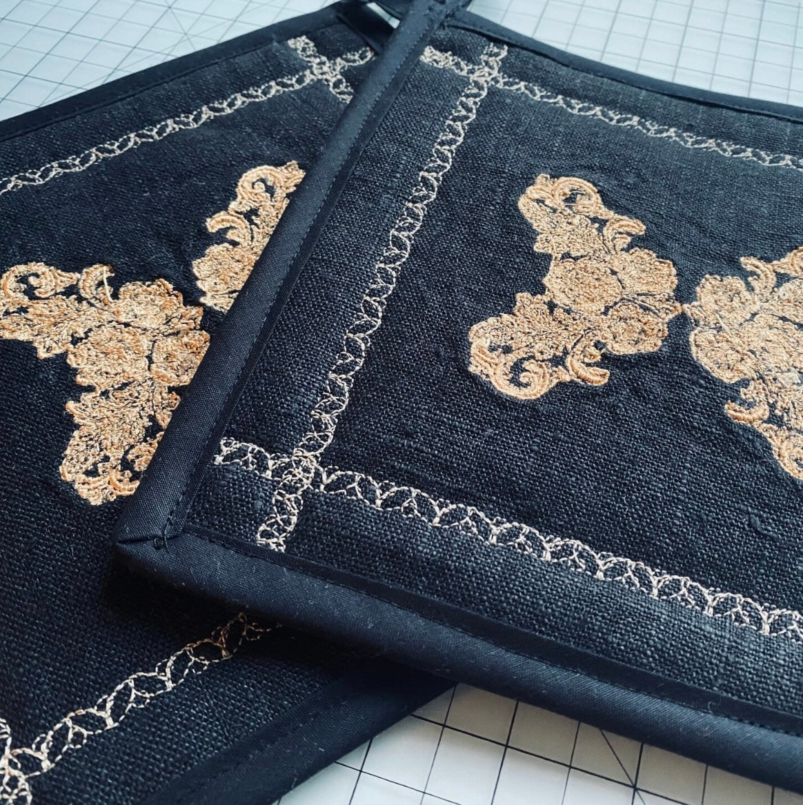 Handsydda grytlappar i linnetyg med guldfärgat spetsbroderi. Set om 2.