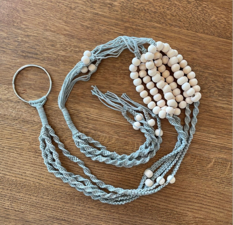 Planthängare i gracilt macramegarn med naturfärgade träpärlor. Handgjord.