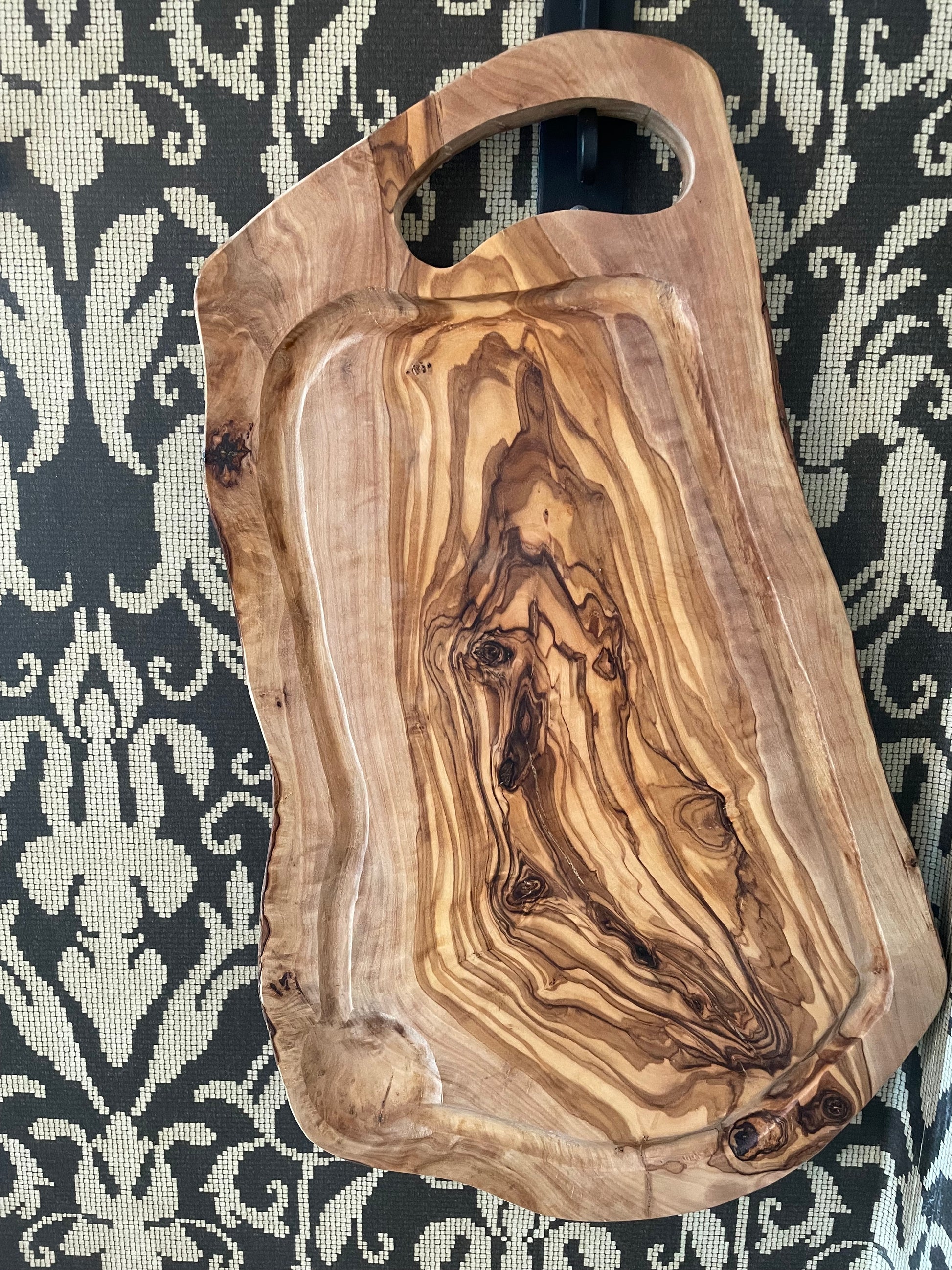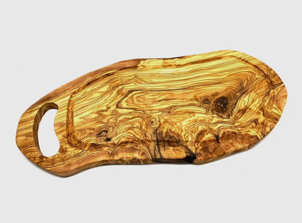 Nice olive wood cutting board with a groove to collect meat juices and a practical handle, 40–44 cm. Excellent for letting meat rest before cutting, but also as a cold meat and cheese board.